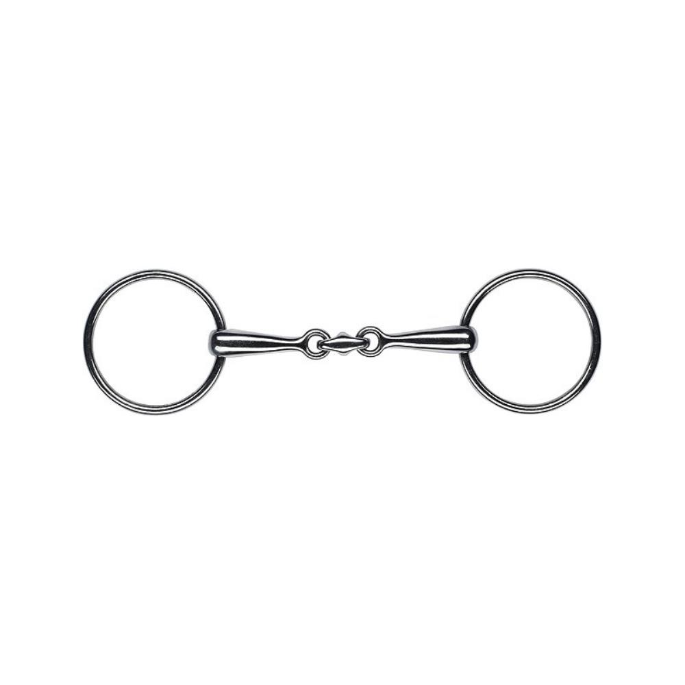 Mors à double brisure anatomique et canons pleins fins. Cette embouchure augmente la stabilité sur la main. De part sa conception, double brisure agrémentée d'une ellipse pleine, il s'adapte parfaitement à la conformation de la bouche du cheval. L'ellipse respecte la forme du palais et évite les blessures et les pincements éventuellement causés par une brisure simple. Ainsi, le confort du cheval est amélioré et votre action de main plus précise, car sans gêne. Le canon plein et large offre au cheval un contact plus doux avec la main du cavalier. Il convient donc aux cavaliers en phase d'apprentissage plutôt qu'un mors avec des canons fins qui sera plus dur. La double brisure située au milieu du canon evite qu'une "pointe" se forme dans la bouche du cheval contrairement à un mors à simple brisure.