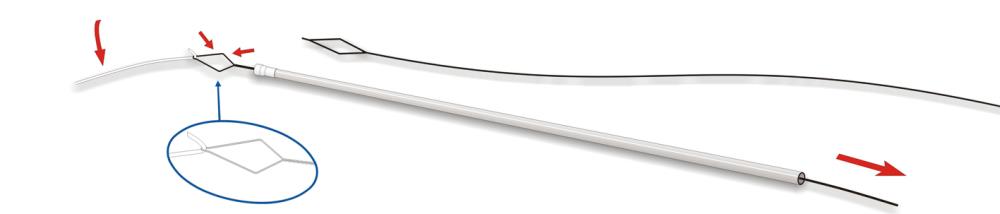 Aiguille passe élastique pour scion creux, acier inox avec anneau spécial pour coincer l'élastique sans faire de nœud.