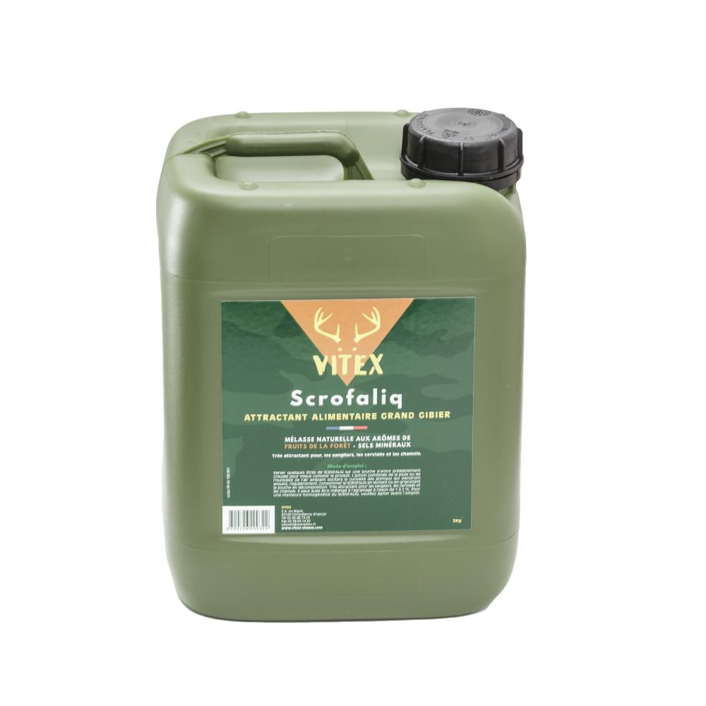 Cet attractant alimentaire Scrofaliq est un arôme liquide conçu pour attirer le grand gibier (chamois, sangliers et cervidés). L'odeur attire fortement le giber. Une utilisation régulière fidélisera les animaux aux points d'agrainage et au territoire.