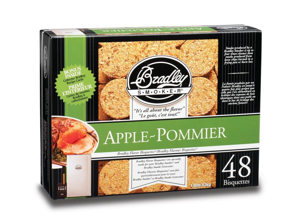 Bisquettes saveur pomme génère une fumée est légère, sucrée, délicate et fruitée, parfaitement adaptée pour le gibier, le poulet et le poisson. Pour produire ces galettes, ces copeaux de bois purs sont compactés en respectant un dosage précis, une pression et une densité parfaitement contrôlées. Le fumoir Bradley® consomme en moyenne une bisquette toute les 20 minutes.