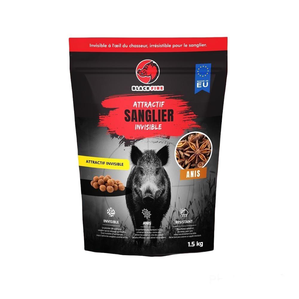 Cet attractant BLACK FIRE invisible à l'anis est un attractif à sangliers ultra-premium qui se fond dans la nature. Presque invisible à l'œil humain et sous forme de bouillettes solides et durables, rend les sangliers fous ! Il vous suffit de disperser 2 ou 3 grosses poignées de bouillettes au sol aux endroits susceptibles d'être fréquentés par des sangliers. Les bouillettes riches en protéines libèrent des arômes et autres attractifs puissants. Le sac peut être utilisé 3 à 5 fois.