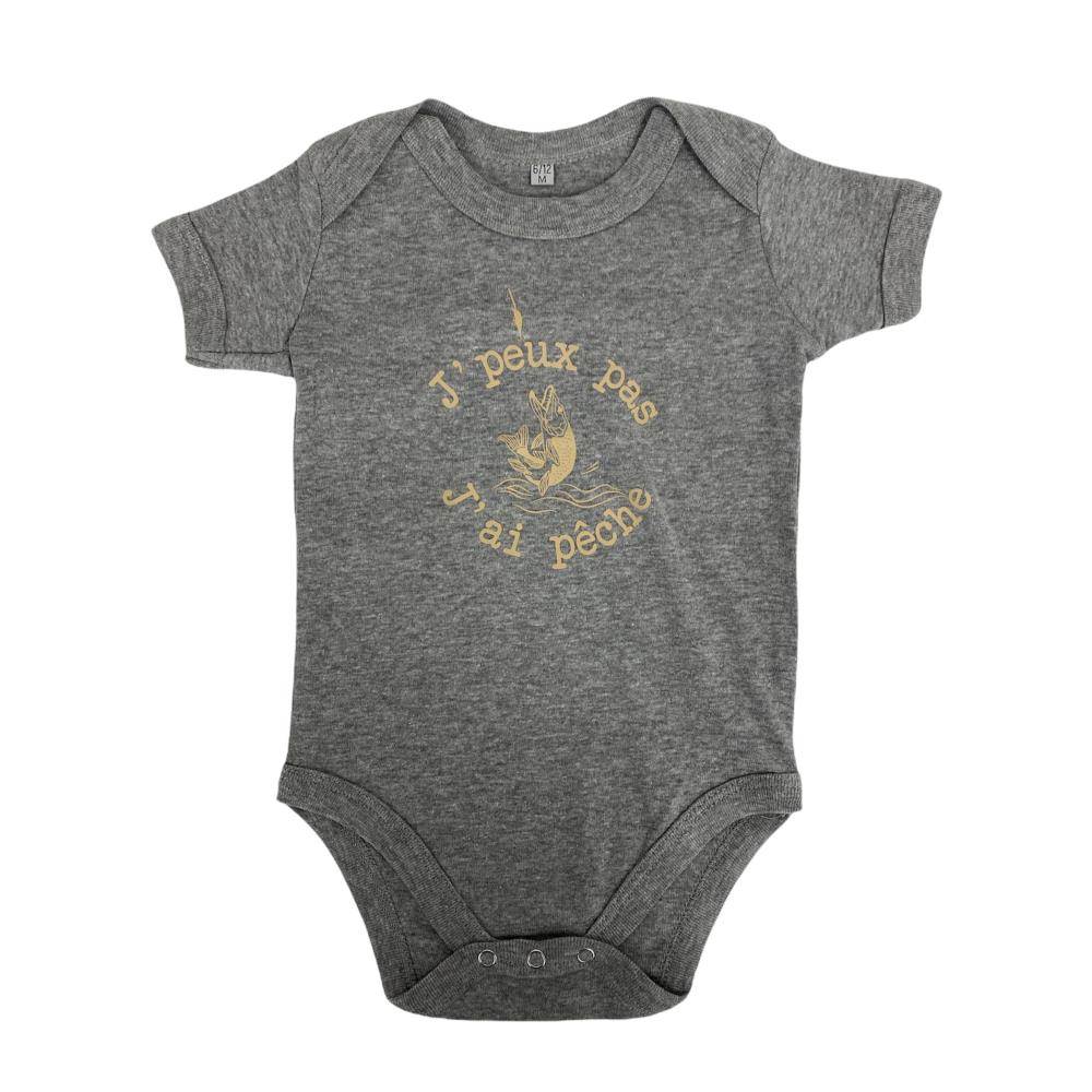 Le body gris Jpeux pas j'ai pêche pour bébé de la marque Bartavel est arboré d'un dessin de pêche et de la phrase "j'peux pas j'ai pêche".