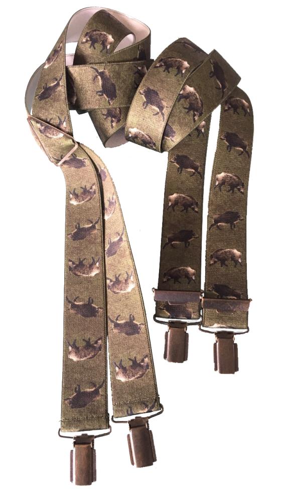 Composition : 80% polyester, 20% élastodiene. Largeur : 5 cm.Taille réglable 150 cm. Motif : sangliers.