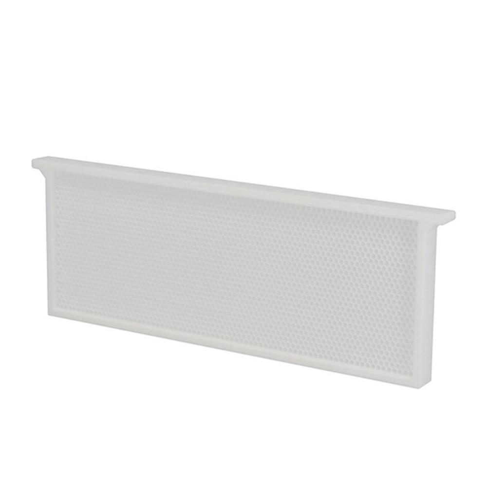Ce cadre plastique Baticadre pour hausse de ruche Dadant est une cadre prêt à l'emploi qui s'utilise sans cire. Le cadre possède une surface augmentée de 9% par rapport à un cadre en bois, empêchant ainsi les abeilles de construire en dehors du cadre. Les cellules sont pré-étirées sur une hauteur de 6 mm, ce qui donne une gaufre de 12 mm incassable à l'extraction. La cadre plastique durable et léger permet également de simplifier le travail de l'apiculteur, grâce à sa forme droite, le temps de désoperculation est diminué. Le temps d'extraction est également réduit, ce qui augmente le rendement. Le travail des abeilles est également facilité, en cas de fortes miellées, le nectar peut être stocké avant de continuer l'étirage des cellules. La forme du cadre est étudiée pour résister à la fausse teigne et au petit coléoptère Aethina Tumida.