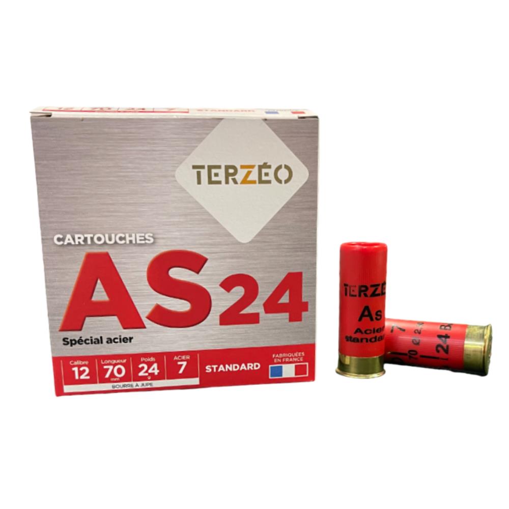 Les cartouches AS24 Terzeo, calibre 12, sont des cartouches françaises standards spéciales acier, fabriquées par Mary Arm pour le tir en compétition.