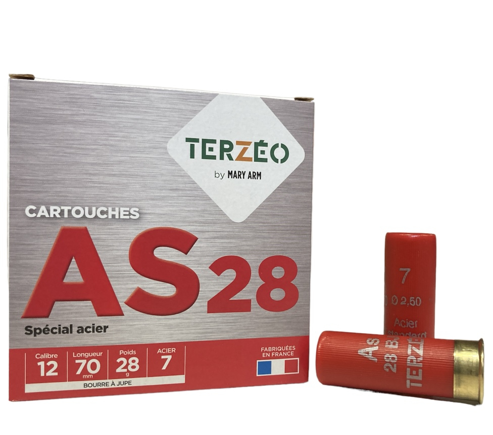 La nouvelle cartouche AS28 est chargée avec 28 grs de billes d'acier. Sa bourre Mary Arm spéciale acier lui permet d'être chargée dans tous les fusils même non éprouvés.