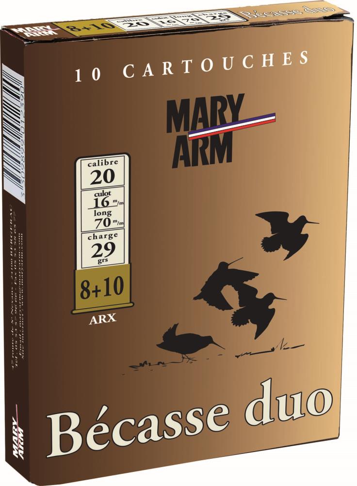 Les cartouches Bécasse Duo de Mary Arm en calibre 20 ont été conçues sur la base des Bécasse Duo calibre 12. L'association de 2 numéros de plomb 8+10 et d'un disperseur ARX procure une amplitude et une régularité de gerbe pour une cartouches en calibre 20. La Bécasse Duo en calibre 20 est idéale pour des tirs entre 10 et 25 m.