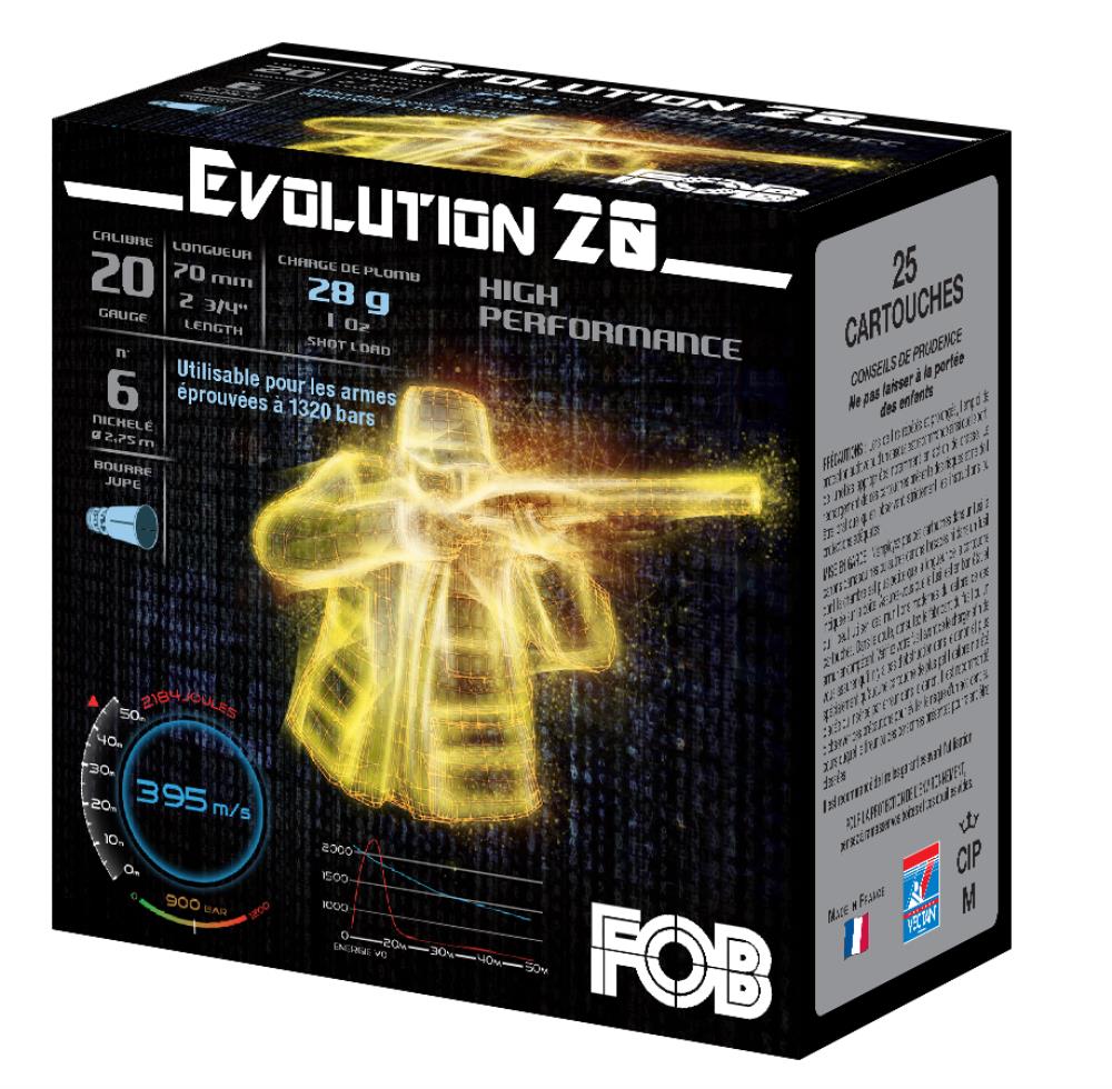 Les cartouches Evolution 20 HP de FOB sont chargées de composants Haute Performance permettant ainsi d'obtenir une vitesse élevée ainsi qu'une gerbe homogène.
