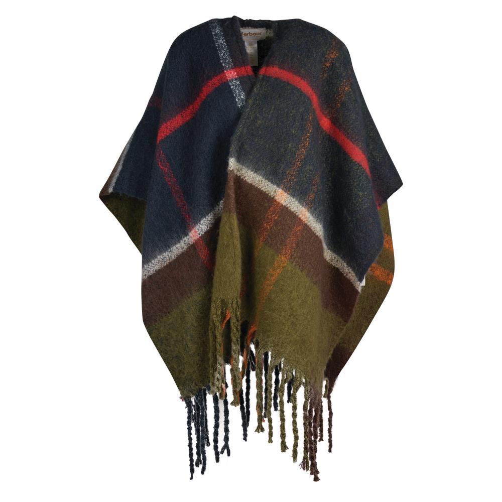 Grand châle à larges carreaux tissé dans les tons automnaux bleu marine, marron et vert. Finitions brossées et bords à franges. Étiquette Barbour tissée à l'arrière du châle.Lire la suite