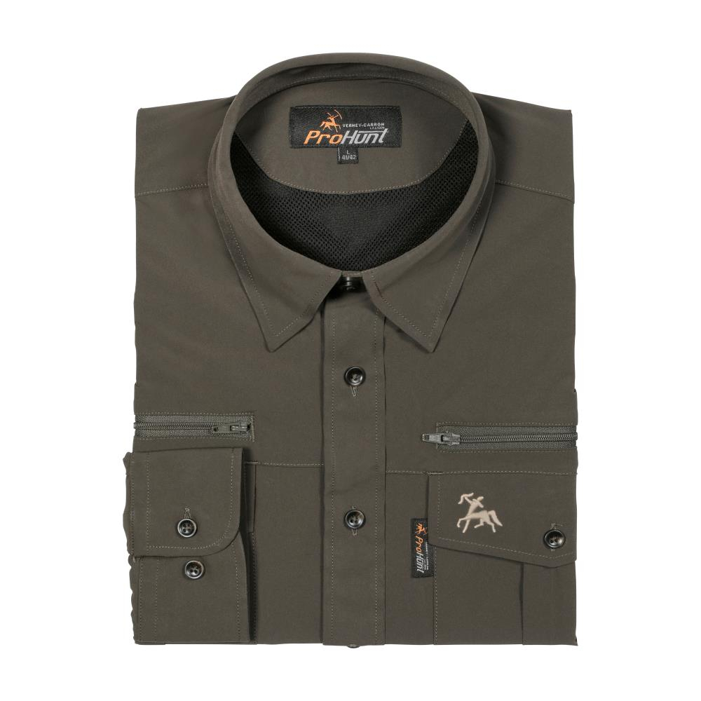 Composition : 88% polyamide, 12% élasthane. Traitement anti-tiques. Col boutonné. 4 poches poitrine. Coloris : kaki. Tailles : du S au 3XL.