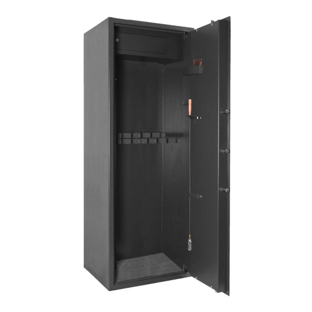 Dimension : Hauteur 150cm, Largeur 45cm, Profondeur 45cm. Capacité : 16 armes avec lunettes compactes. Tapis de protection au sol. Coffre intérieur avec clef indépendante. Coloris : Noir. Poids : 69kg.