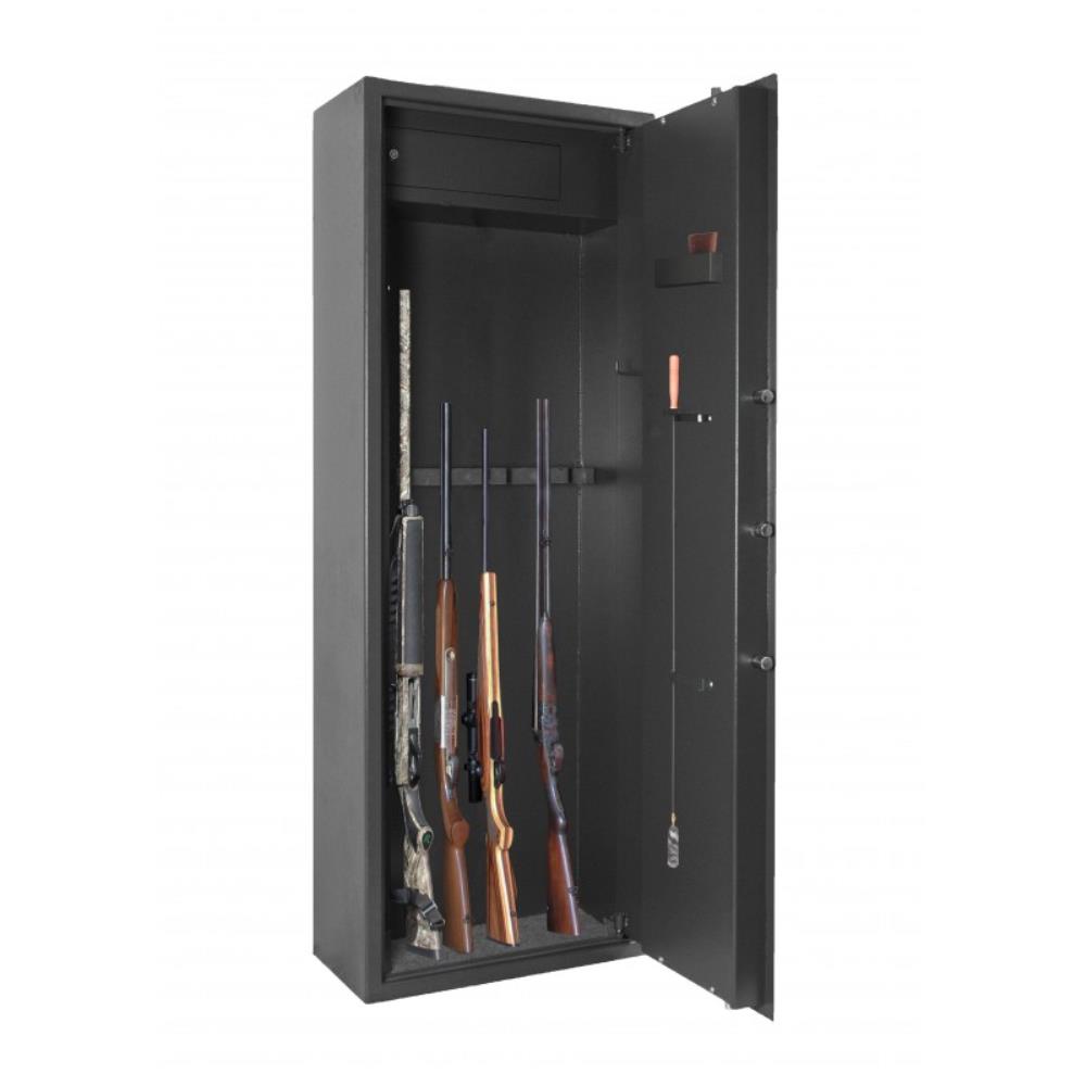 Dimension : Hauteur 150cm, Largeur 45cm, Profondeur 30cm. Capacité : 8 armes avec lunettes. Etagères, rayonnage. Tapis de protection au sol. Coloris : Noir. Poids : 48kg.