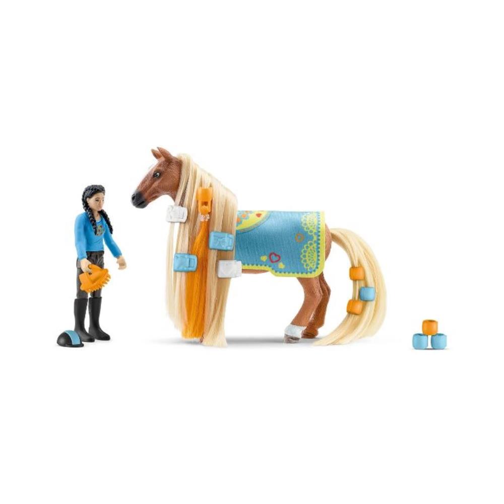 Le coffret figurine starter set Kim et Caramelo Sofias' beauties de Schleich® reprend tous les accessoires que l’on peut retrouver lorsque l'on coiffe son cheval. Dans ce coffret on retrouve Kim, cavalière, et sa jument Caramelo. Ce coffret est recommandé pour les enfants de 3 à 8 ans. Vous retrouverez de nombreuses fonctions ludiques et tous les accessoires vous garantiront de formidables moments de divertissement. Kim pourra alors brosser les crins de sa jument Caramelo avec la brosse, les coiffer avec les pinces et les perles à crins. Elle pourra aussi couvrir sa jument d'une couverture.