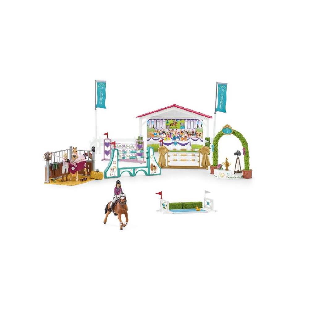 Le coffret Tournoi équestre entre amis de Schleich® reprend tous les accessoires que l’on peut retrouver sur un concours hippique Dans ce coffret on retrouve 2 personnages : Sofia et Lisa, cavalières, qui chevauchent une jument arabe et une jument Trakehner. Ce coffret est recommandé pour les enfants de 5 à 12 ans. Vous retrouverez de nombreuses fonctions ludiques et tous les accessoires vous garantiront de formidables moments de divertissement. Les figurines sont entièrement articulées et pourront utiliser une brosse ou un cure-pied pour panser et soigner leurs chevaux mais pourront également équiper leur cheval pour participer au concours. Enfin une tribune et un podium vous permettront d’assister à la remise des prix de ce concours. Dans ce coffret vous retrouverez tout ce qu’un cavaliers pourra rencontrer dans un vrai concours hippique : une tribune avec des spectateurs, un box pour le cheval, deux figurines de cavalières articulées (Sofia et Lisa), une jument Trakehner, une jument arabe, une souris, quatre clôtures, deux brides avec rênes, deux selles, un obstacle rivière, deux fanions, un buis en pot avec arche, deux ballots de paille, un podium, une barre d’obstacle cœur, une barre d’obstacle dorée, une caméra sur pied, un canard en plastique, une pomme, un bouquet de fleurs, une brosse douce, un cure-pied, deux bombes, deux cocardes, deux bracelets.