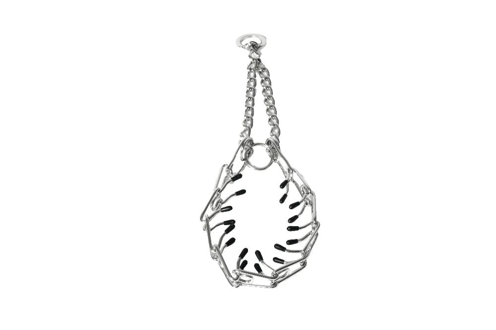 Ce collier chaîne est un collier de dressage conçu pour les chiens très turbulents à gros gabartis. Ce collier semi-étrangleur possède des mailles détachables et des picots couverts par des protections en caoutchouc amovible. La traction du collier resserre celui-ci sur le cou du chien et sanctionne immédiatement l'animal désobéissant ou impulsif.