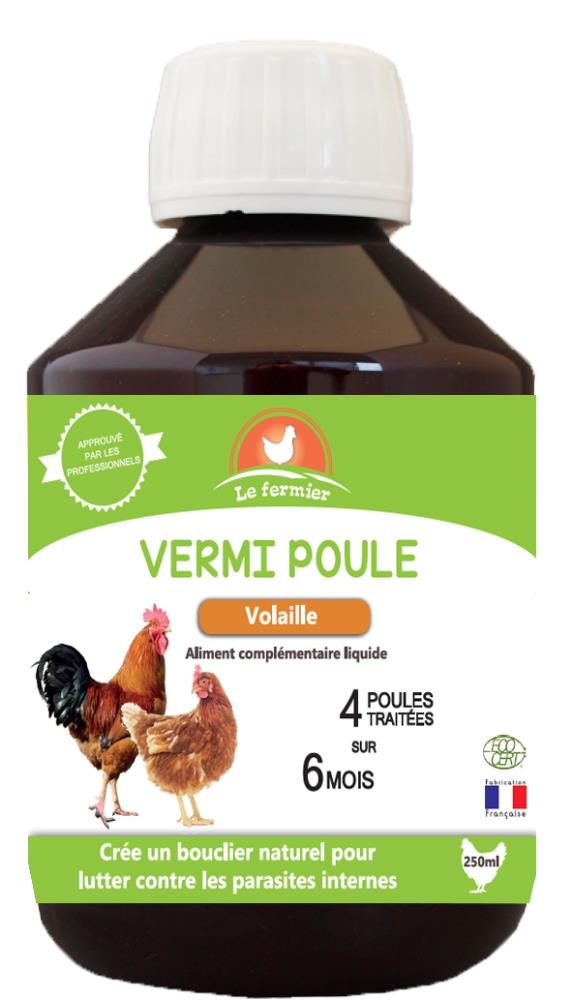 Ce complement Vermi Poule est un aliment complémentaire pour volailles (poule, canard, dinde, oie…). Il est conçu pour améliorer la résistance naturelle des volailles contre le parasitisme interne. Ce complément alimentaire n'altère pas le goût ni l'odeur des œufs et de la chair pouvant être consommés sans risque pendant la durée du traitement.
