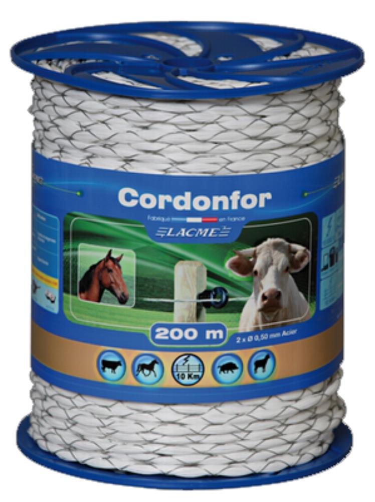 Ce cordon Cordonfor est une cordelette adaptée pour les clôtures semi-permanentes et aux électrificateurs secteur et aux accumulateurs. Cette cordelette possède une grande visibilité, est très robuste, efficace et fiable grâce à une réelectrification permanente. Elle est idéal par exemple pour renforcer la visibilité d'une installation Forceflex.