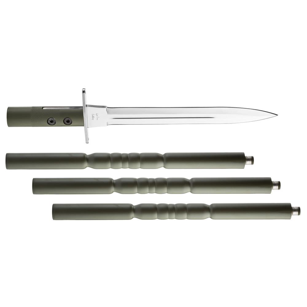 Sa dague en inox particulièrement résistante s’appuie sur une lame épaisse, stable à l’impact et adaptée aux usages intensifs. Le manche en aluminium est composé de trois tronçons qui s’assemblent pour former une lance à la bonne portée, offrant un bon compromis entre rigidité, maniabilité et encombrement une fois démontée.