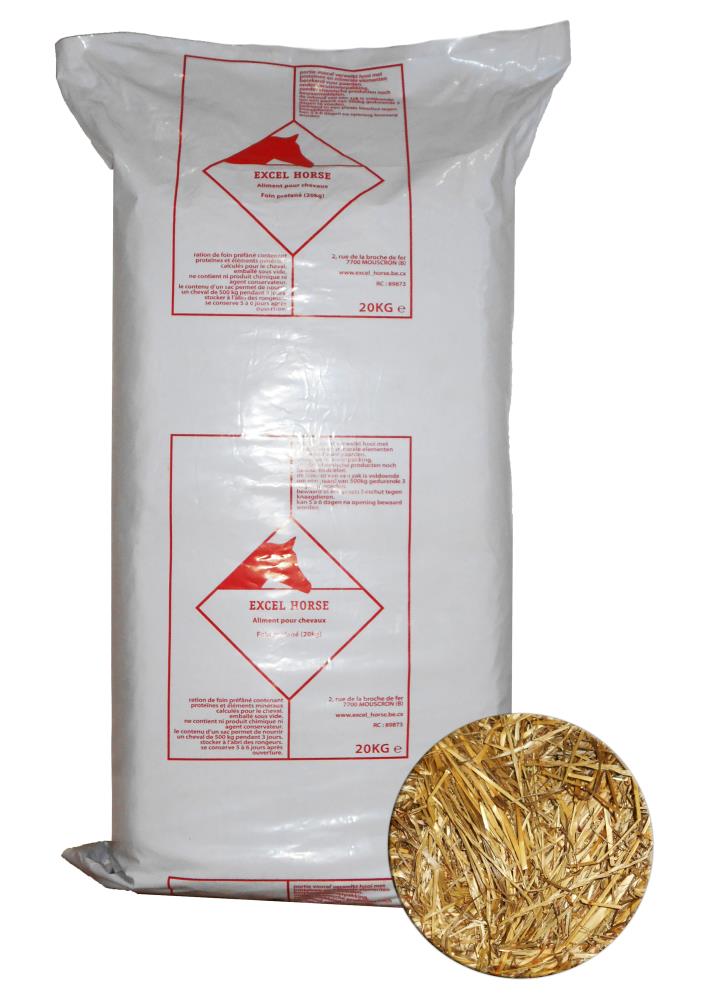 Sac de 20kg. Ne contient aucun agent conservateur ni produit chimique. A base uniquement d'herbe 100% naturelle avec un taux de matière sèche suffisant (75%) pour le rendre totalement dépourvu de poussière. Evite ainsi les problèmes de toux, d'emphysème du cheval. CONSEILS D'UTILISATION : Couper le sac d'Excel Horse dans le sens de la largeur, environ à la moitié et distribuer. Un sac de 20 kg permet de nourrir un cheval de 500 kg pendant 4 à 5 jours en complément de sa ration de base.