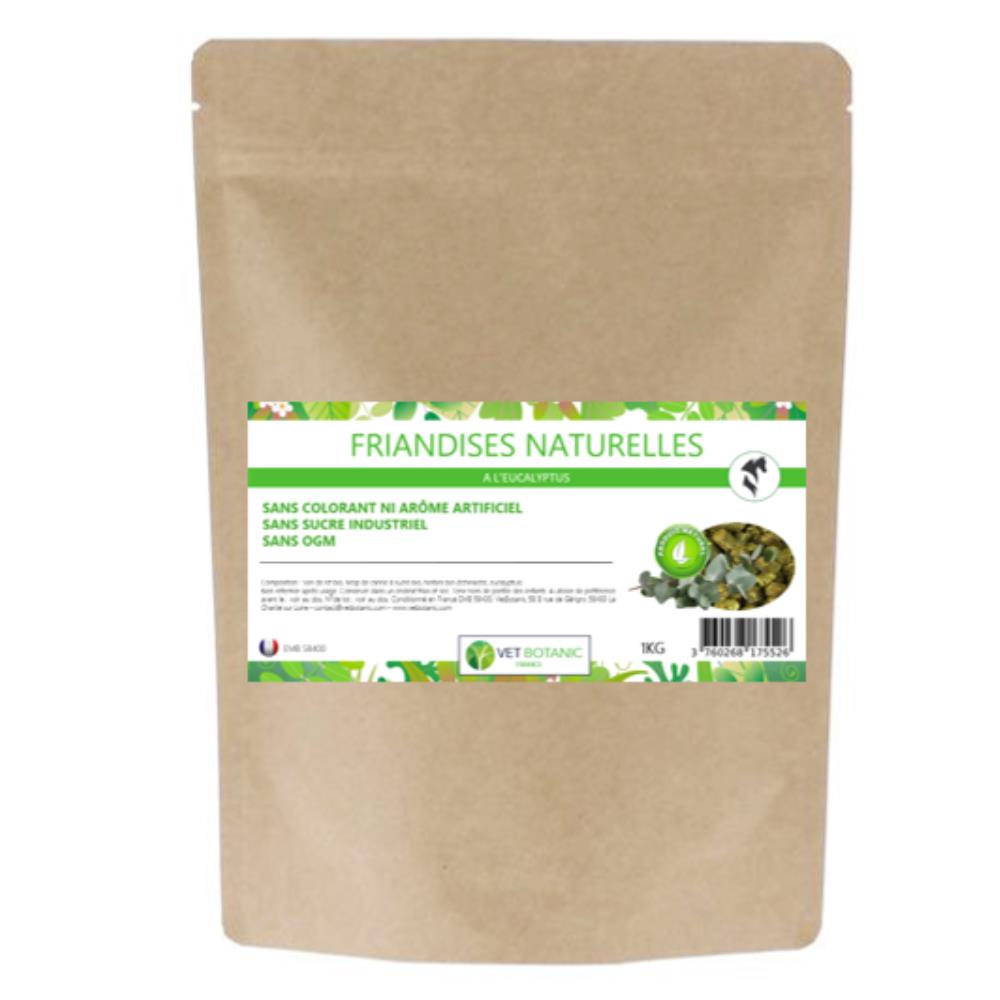 Les friandises à l'eucalyptus de chez Vet botanic pour les chevaux et le poneys sont naturelles. Elles sont formulées sans céréales pour une meilleure assimilation et sont à base de plantes. L'absence de sucre industriel, de colorant et sans arôme artificiel permet de proposer une friandise naturelle à vos animaux. La forme en stick de 2 ou 3 cm de long facilite la distribution et ne s'effrite pas dans les poches. Composée de 25% de fibres, la friandise est source de fibres. Vous pouvez donner ces friandises en complément d'une bonne alimentation pour récompenser le cheval par exemple.Lire la suite