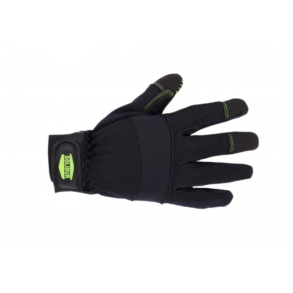 Les gants de travail Solidur sont des gants alliant confort et solidité. Ils sont en cuir synthétique et possèdent des renforts sur la paume de la main et sur le bout des doigts ainsi que des grips. Le dos de la main est en Spandex, ce qui apporte de la souplesse aux gants. Les gants de travail Solidur se referment grâce à une bande élastique et auto-agrippante que vous pourrez serrer à votre convenance. Ces gants sont légers et souples, ils sont agréables à porter et sont idéaux pour éviter de vous blesser lors de vos travaux. Ils sont de couleur noire avec des détails verts qui lui ajoutent une touche de peps.