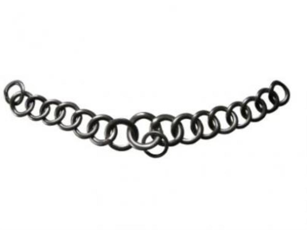 Gourmette à grosse maille et anneaux plats à placer sous la machoîre du cheval. Une gourmette agit sur le nerf mandibulaire et a un effet de levier