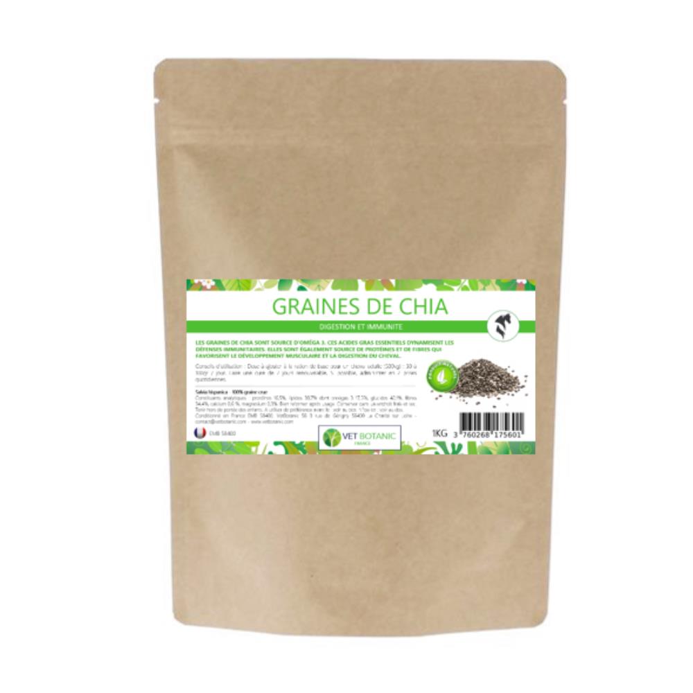 Composition : graines de chia 100%. Constituants analytiques : protéines 20%, matières grasses 34%, glucides 0,9%, fibres 38%, teneur en eau 7%. Conseils d’utilisation : la graine de chia s’utilise crue. Dose à ajouter à la ration de base pour un cheval adulte (500kg) : 30 à 100 g par jour. N’hésitez pas à demander l’avis de votre vétérinaire avant utilisation ou prolongation. Pour les juments gestantes ou allaitantes, n'hésitez pas à vous raprocher de votre vétérinaire.