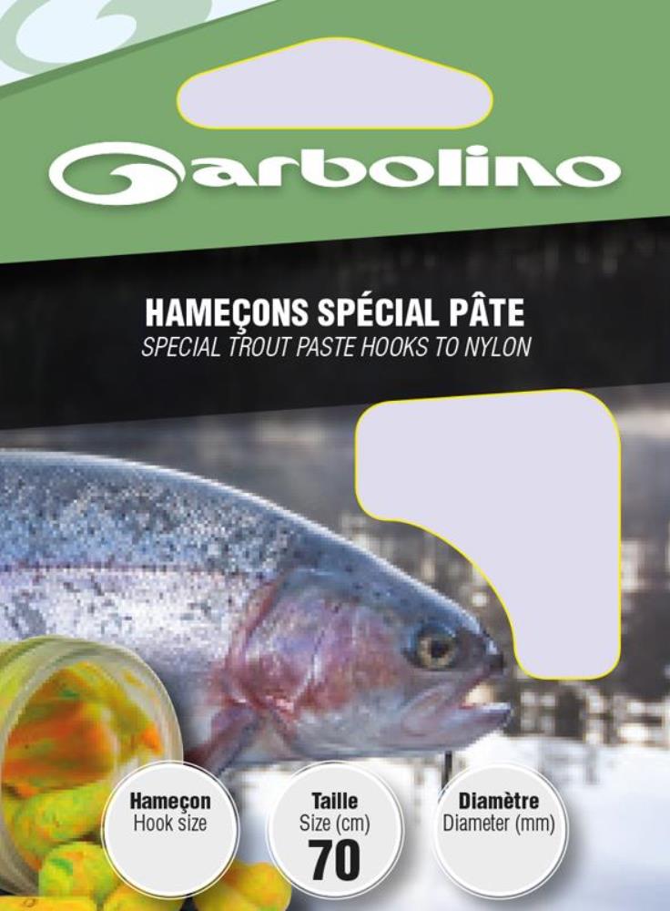 Hameçons montés spécial pâte de 70 cm de long terminés par un hameçon spécial truite bleu forgé renversé.Lire la suite