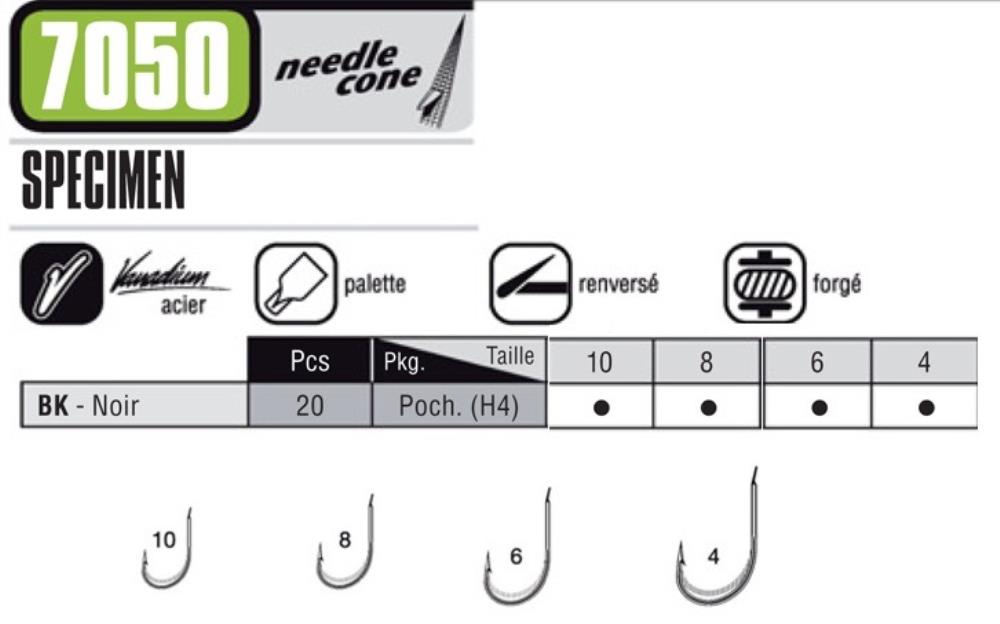 Vendu par 10. Taille hameçon : 10. Acier VMC : Vanadium. Palette. Renversé. Forgé. Pointe Needle Cone.