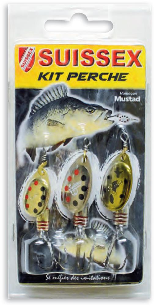 Kit cuillers Suissex spécial Perche composé de: 1 cuiller Suprem Or PRN N°1. 1 cuiller Suprem Argent PRN N°2 et 1 cuiller Suprem Vairon N°2.
