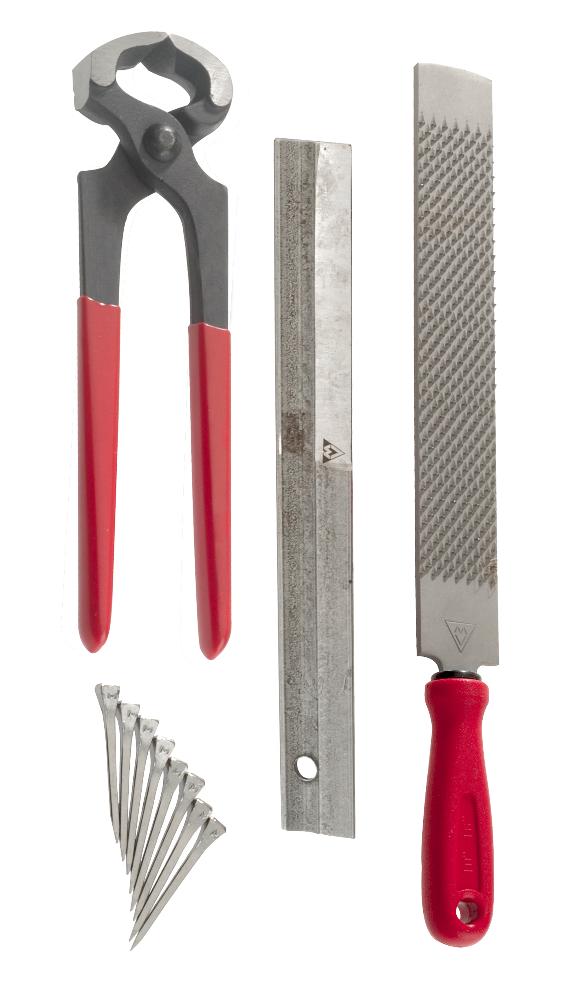 Kit de dépannage en maréchalerie (1 rogne pied, 1 râpe + 1 manche, 1 tricoise marteau et 8 clous E5). Léger et compact, idéal pour la remise en place d’un fer quelle que soit la situation.