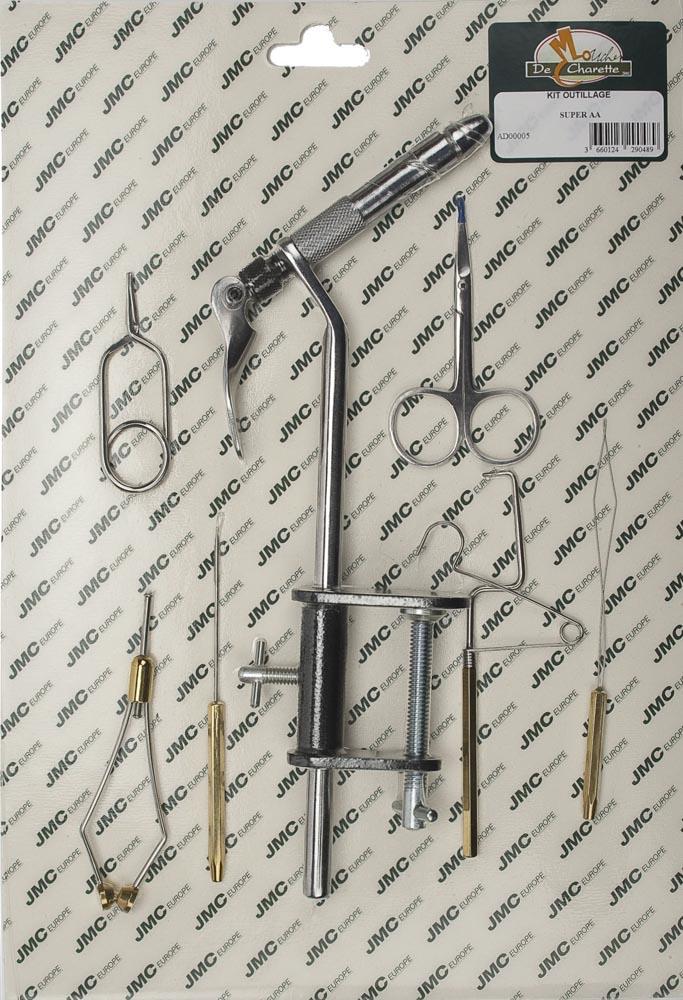 Kit composé de : un étau super AA, un porte bobine tube fine, un whip finish english, un ciseau medium standard, une pince à hackle standard large, une aiguille à dubbing et un passe fil.