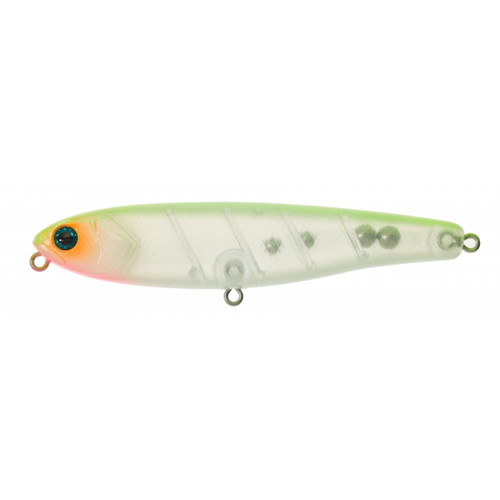 Action : Walking the dog. Modèle : Flottant. Poids : 17,5G. Taille : 107MM. Profondeur : Surface. Hameçon : 6062-1X-NP #2 BN. Coloris proposés : BONIE, NF AYU, GHOST CHART BACK, MAT LEMON.