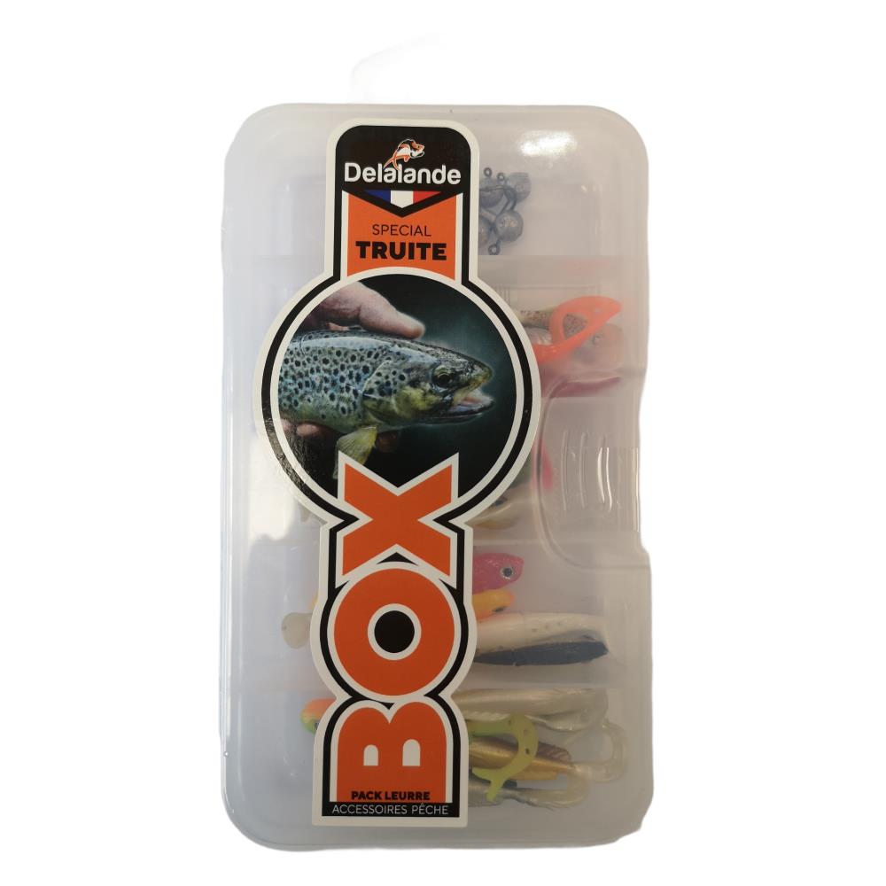Le kit truite Delalande contient 20 leurres souples avec les têtes plombées adaptées. A ranger dans un gilet de pêche ou un chest pack. Boite réutilisable.