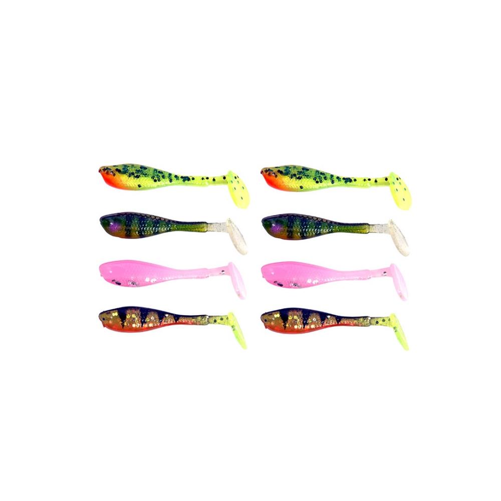 Modèle : Micro fry. Quantité : 8. Taille : 4 cm. Coloris : Lemon Tiger UV x 2, Sticklebait UV x 2, Pink Candy UV x 2 et Perch UV x 2.