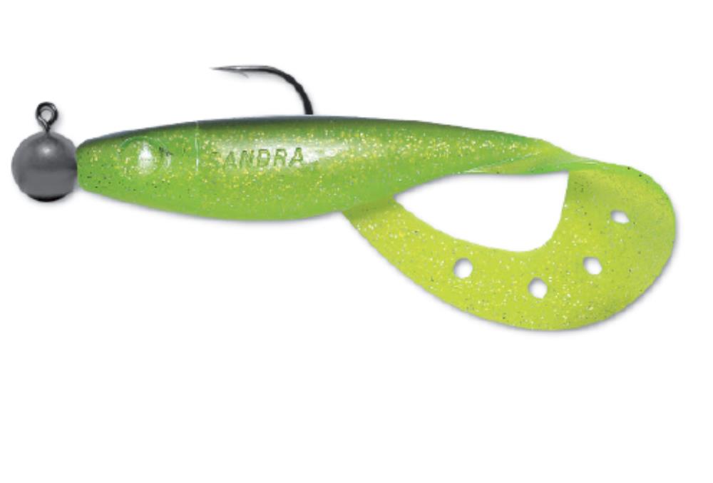 Ce leurre légendaire, permet la capture de tous les carnassiers du monde aussi bien dans les mains d’un expert que d’un débutant. Leurre à section triangulaire, il possède l’exceptionnelle qualité d’action d’une virgule et d’un shad. Son corps pisciforme évoque parfaitement un poisson et sa queue en forme de faucille génère de forts signaux vibratoires de basse fréquence et visuellement donne la même impression qu’une double queue. Le Sandra s’anime en moulinant à petite vitesse et peut être monté de multiples façons : têtes plombées, texan, drop shot, carolina, monture mort manié, etc.