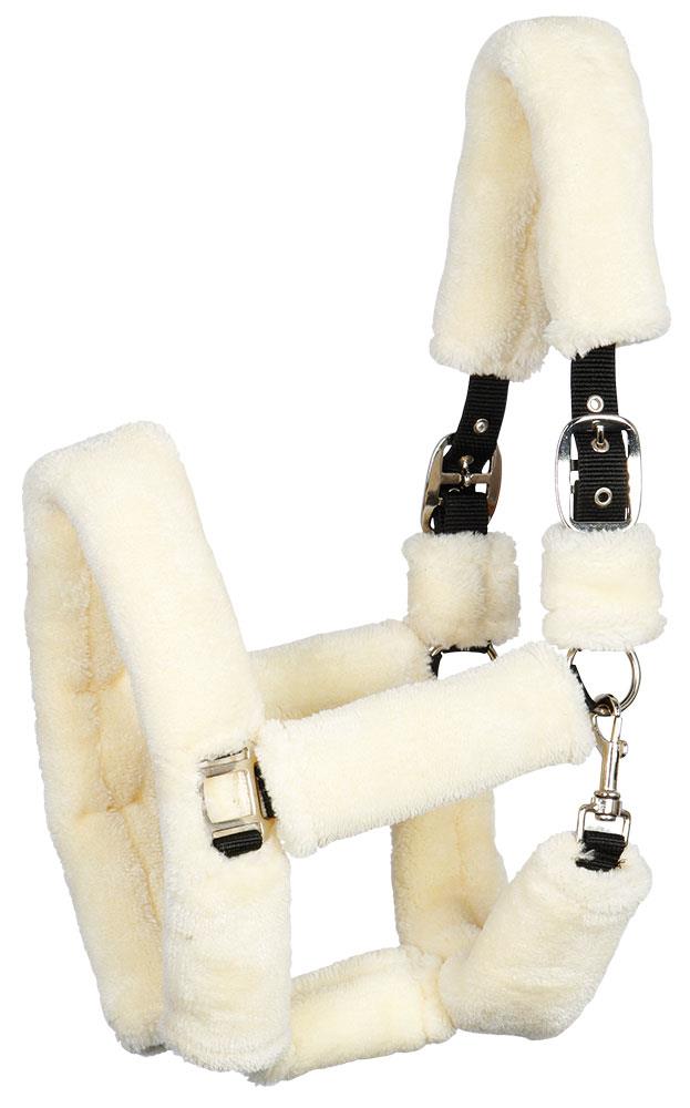 Licol de transport en nylon muni d'un réglage au niveau de la têtière et de la muserolle. Entièrement doublé en fourrure synthètique, idéal pour les chevaux à la peau sensible aux frottements.