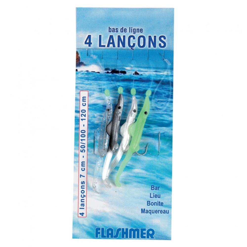 Bas de ligne 4 lançons 7 cm assortis pour Bar, Lieu, Maquereau, Orphie.