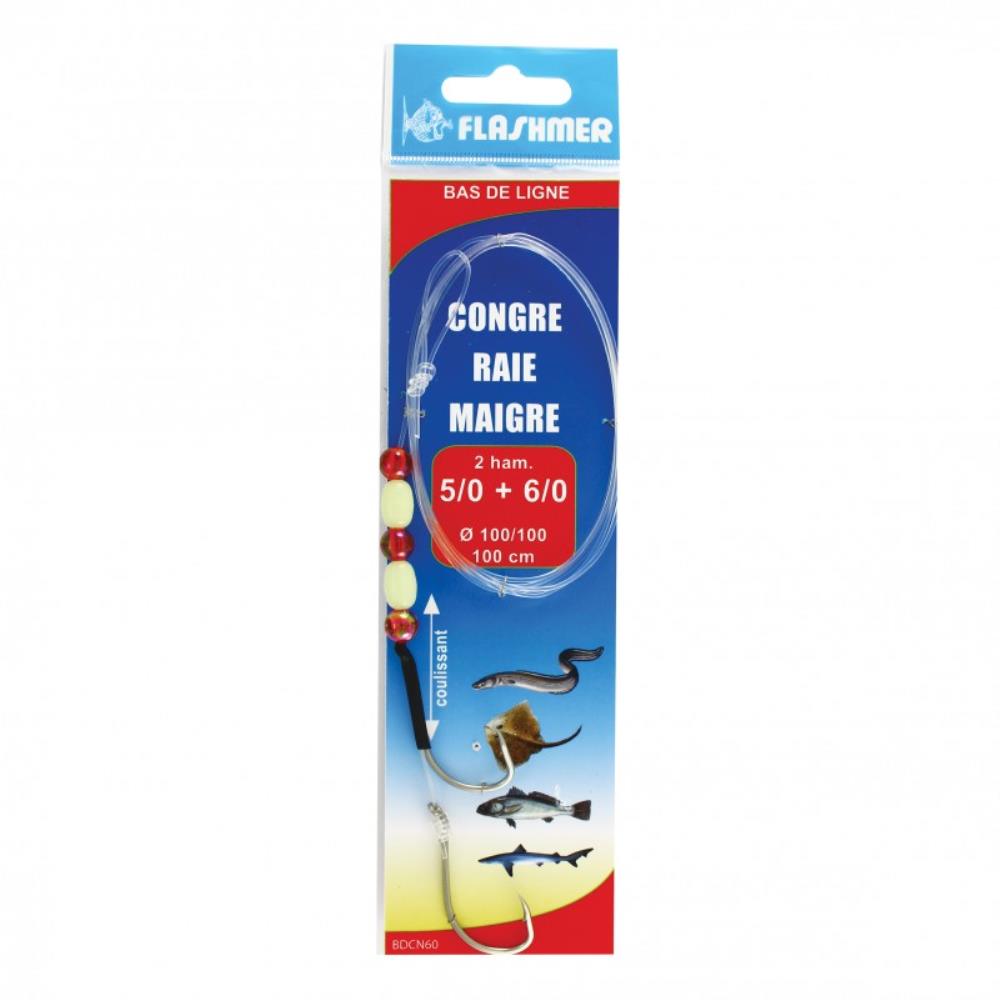 Ce montage destiné aux poissons de grande taille (congre, raie, maigre) permet d’escher efficacement les plus gros appâts (calamars, seiches, poissons entiers, etc.). Les hameçons à large ouverture de type octopus sont des forgés fort de fer ultra piquants en 5 et 6/0. Ceux-ci sont montés du nylon 100/100 très résistant permettant les combats en force avec des poissons très puissants. Ce montage de type « Stewart » est réglable. L’hameçon du haut étant maintenu dans une gaine silicone thermorétractable, il est coulissant et peut être positionné en fonction de la longueur de l’appât sélectionné. Son coulissement dur permettra un ferrage optimal. Des perles rouges aux reflets irisés ainsi que des perles phosphorescentes jouent le rôle de teasers afin d’attirer les poissons vers l’appât.