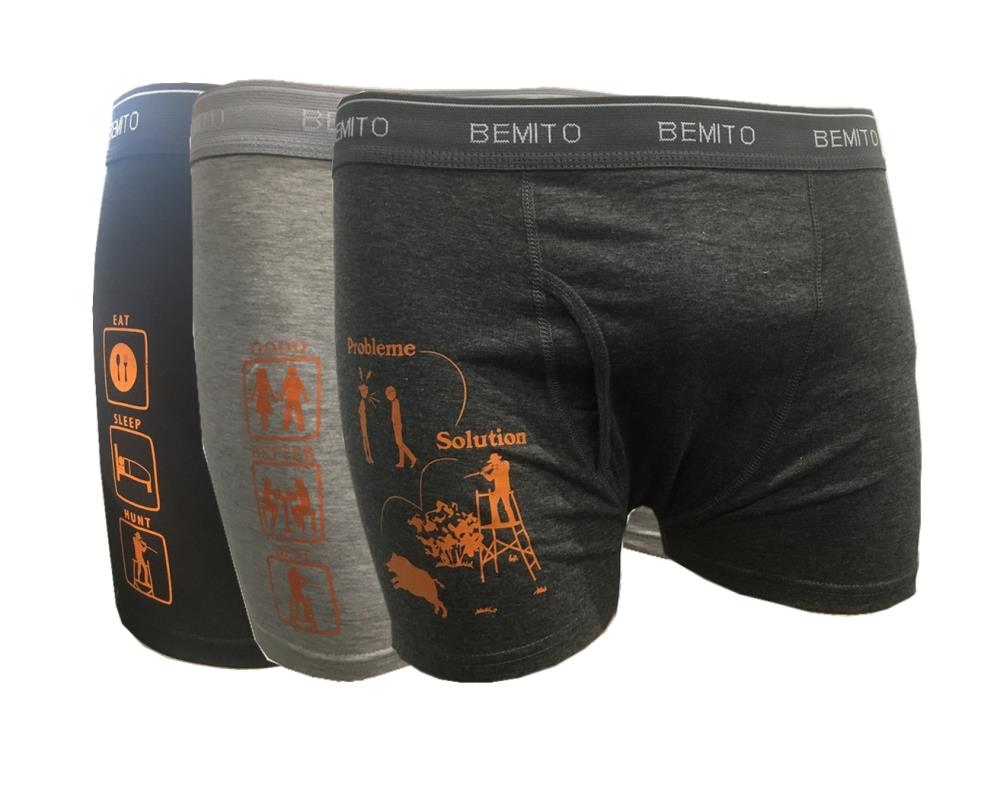 Le lot de 3 boxers humoristiques est le cadeau parfait pour les passionnés de chasse. Le lot est composé d'un boxer noir, d'un boxer gris anthracite et d'un boxer gris chiné. Chacun de ces boxers est imprimé d'un motif humoristique.