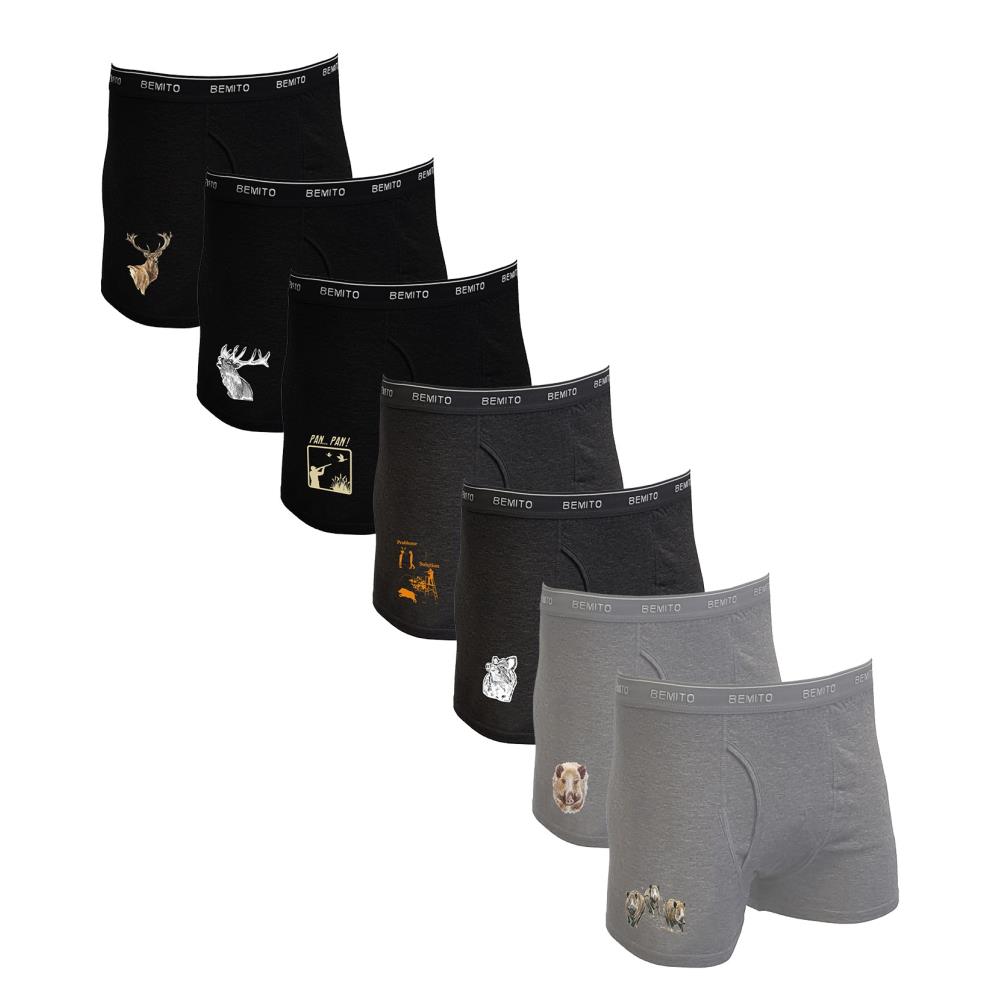 Lot de 7 boxers. Composition : 100% coton. Motifs sur le thème de la chasse sur chaque boxer. Coloris : noir/gris . Tailles : du M au 3XL.