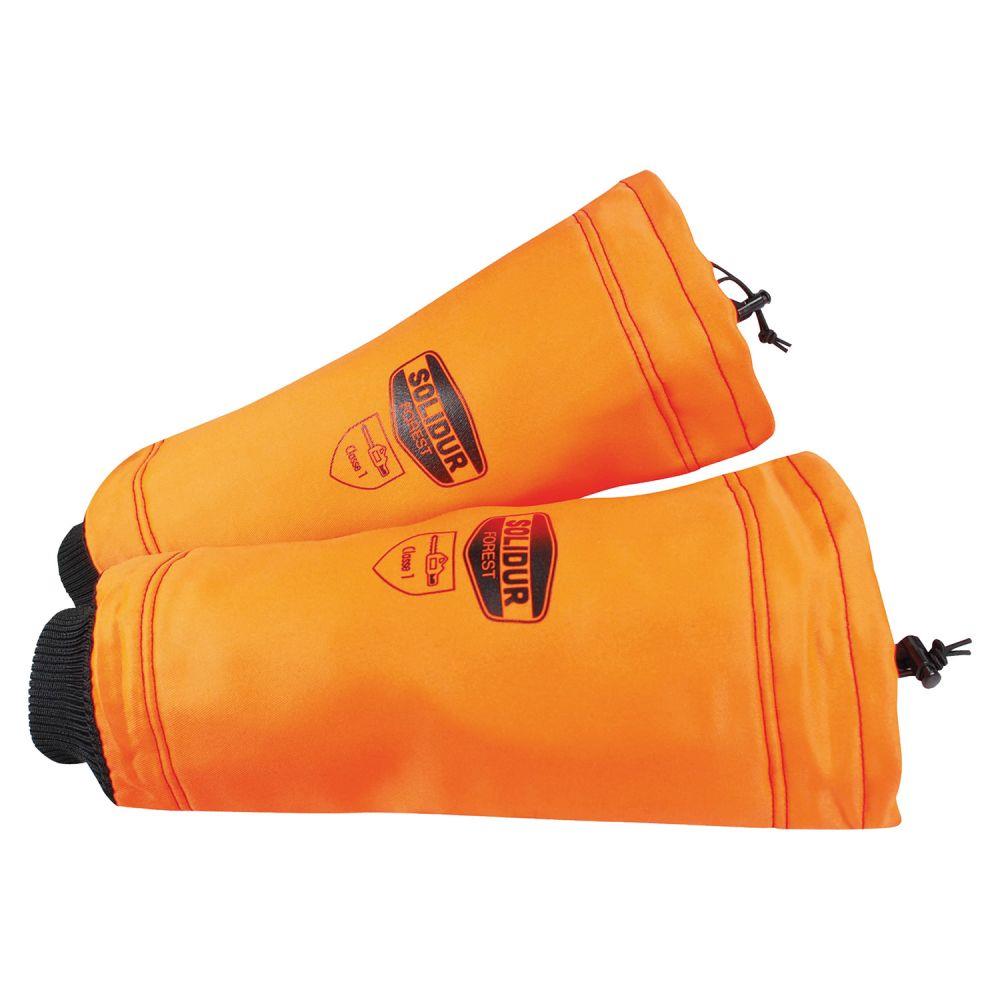 Composition : Polyester 150 g hydrophobe. Fixations : Élastique de serrage derrière le coude avec stop cordon. Classe de protection scie à chaîne : classe 1 (vitesse de chaîne de 20 m/s). Coloris : Orange. Taille unique.
