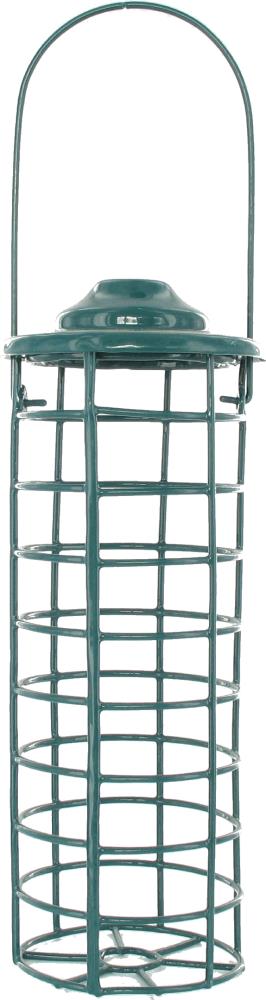 Dimensions : Ø 8 x 21,5 cm. Grille en métal recouverte d'une peinture anti-rouille. A suspendre. Anse en métal pour suspension. Mangeoire à remplir.