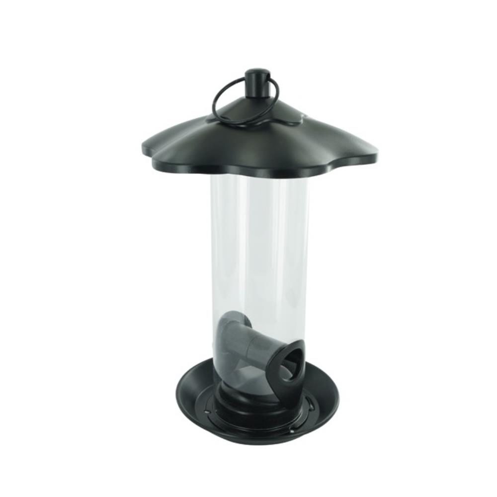 Dimensions : Hauteur : 27 cm. Diamètre : Couvercle : 17 cm. Matières : Métal peint noir epoxy (résiste aux intempéries), tube en polycarbonate transparent, toit et socle en acier. Haute résistance aux UV et au gel. INSTALLATION : Placer sur une branche ou sur un poteau. CONSEILS : Nettoyer régulièrement la mangeoire avec de l'eau et du savon pour réduire le risque de dévelippement des maladies.