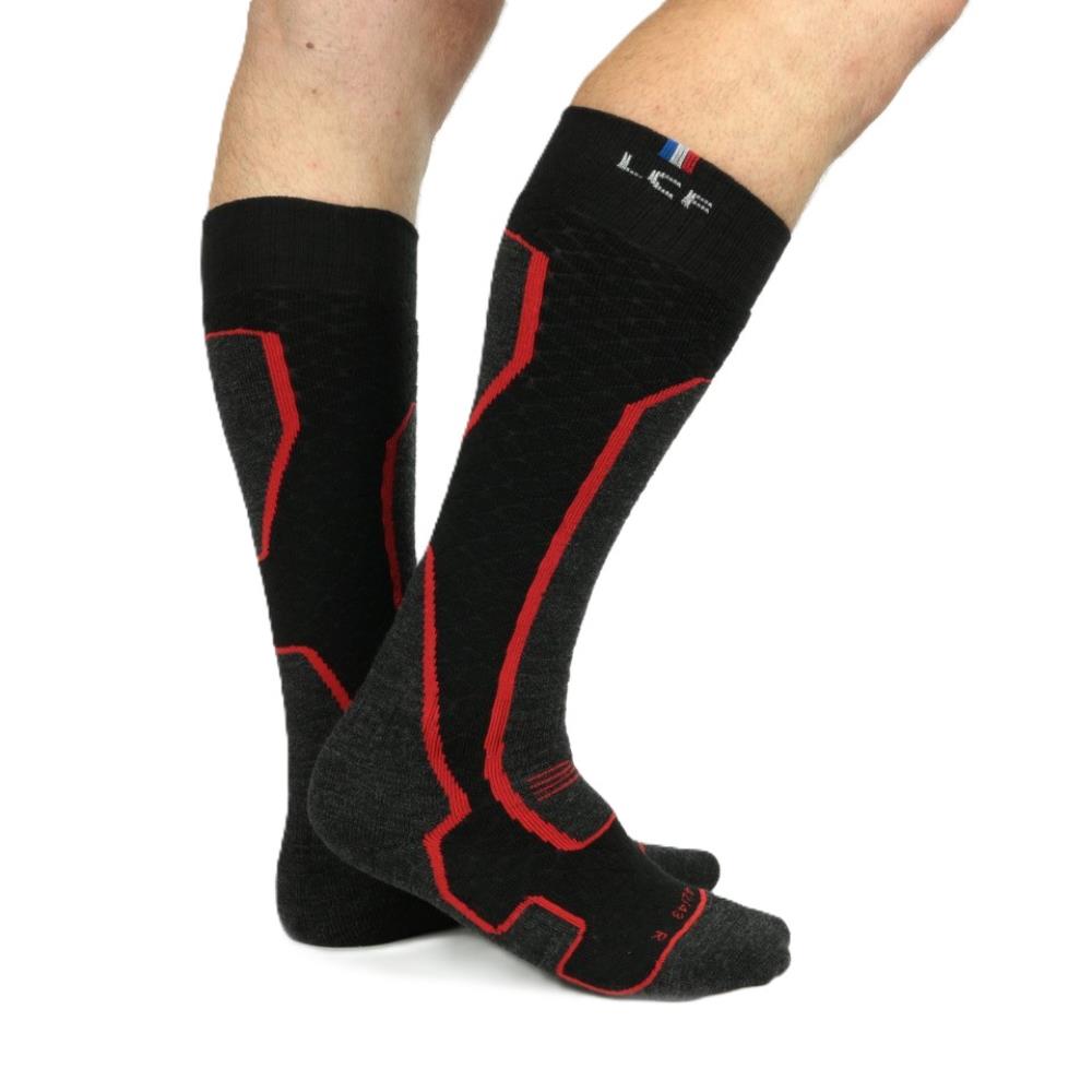 Composition : 35% de laine mérinos. Coloris : noir rouge. Pointures : du 38/39 au 44/46.