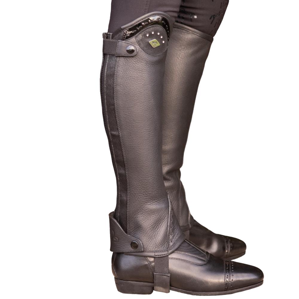Composition : 100% cuir de vachette. Coloris : noir. Conseil d'entretien : Les mini-chaps Pénélope peuvent être nettoyées avec du savon glycériné, puis, une fois sèches, de l'huile pour cuir peut être appliquée en fine couche.