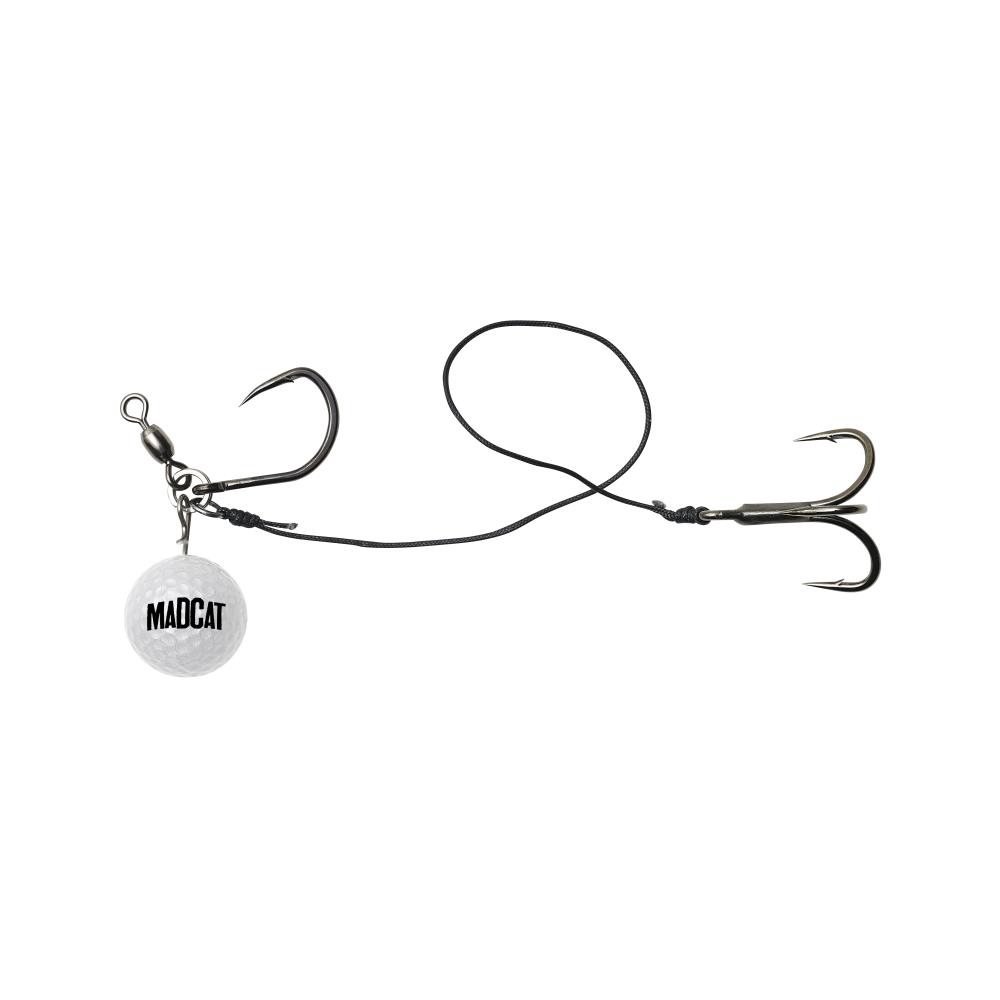 Un système pour la pêche du silure en verticale équipée d’une plombée clipsable Vertiball. Tous les composants (émerillon, anneau brisé, tresse et hameçons) sont renforcés.