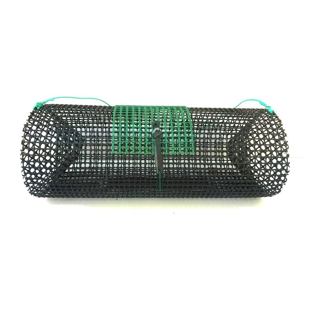 Poids : 0.5 kg. Dimensions : 50 cm. Forme : Cylindrique. Couleur : Noir. Nb. de goulots : 2 (50 mm). Maillage : Mailles plastiques carrées de 10 mm. Remarque : Toutes les nasses sont équipées d’un lest en fer laminé plat, recouvert d’une peinture anti-rouille et d’une sangle.