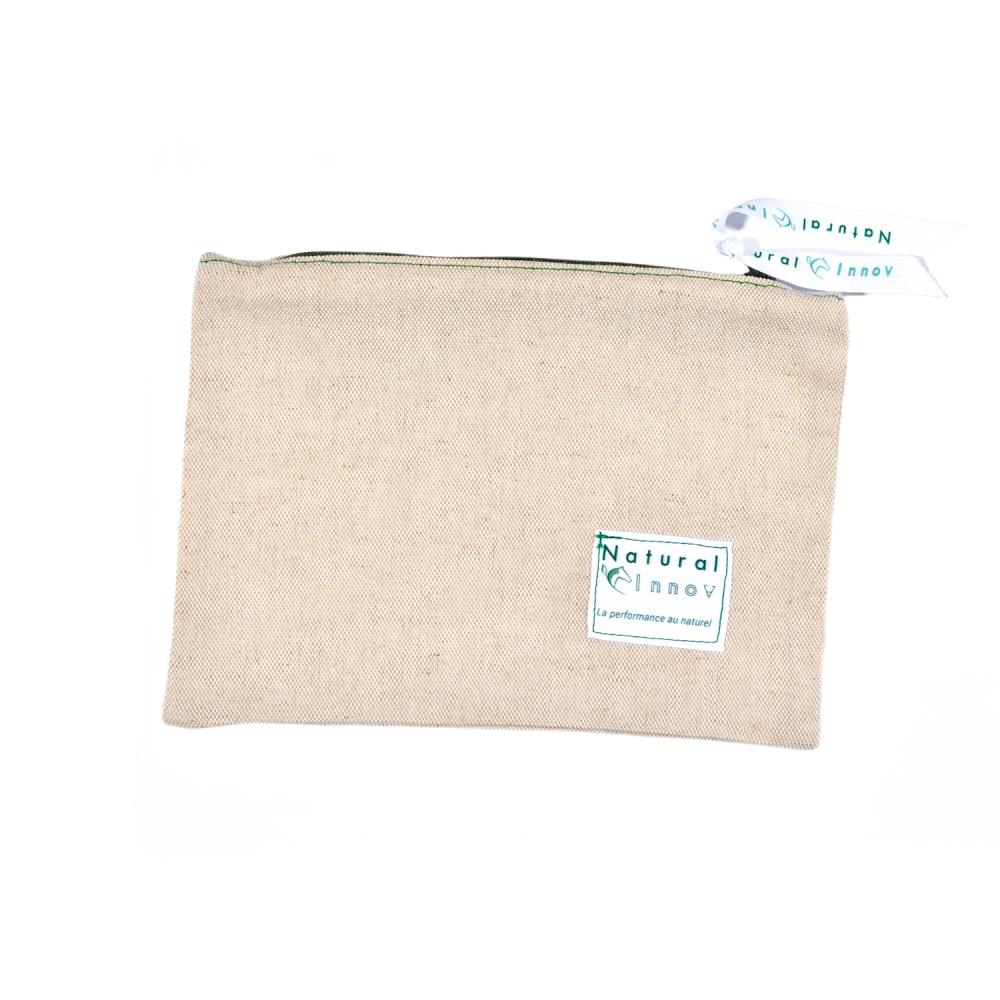 Une trousse en tissu, complètement confectionnée à la main et customisée aux couleurs Natural’Innov.