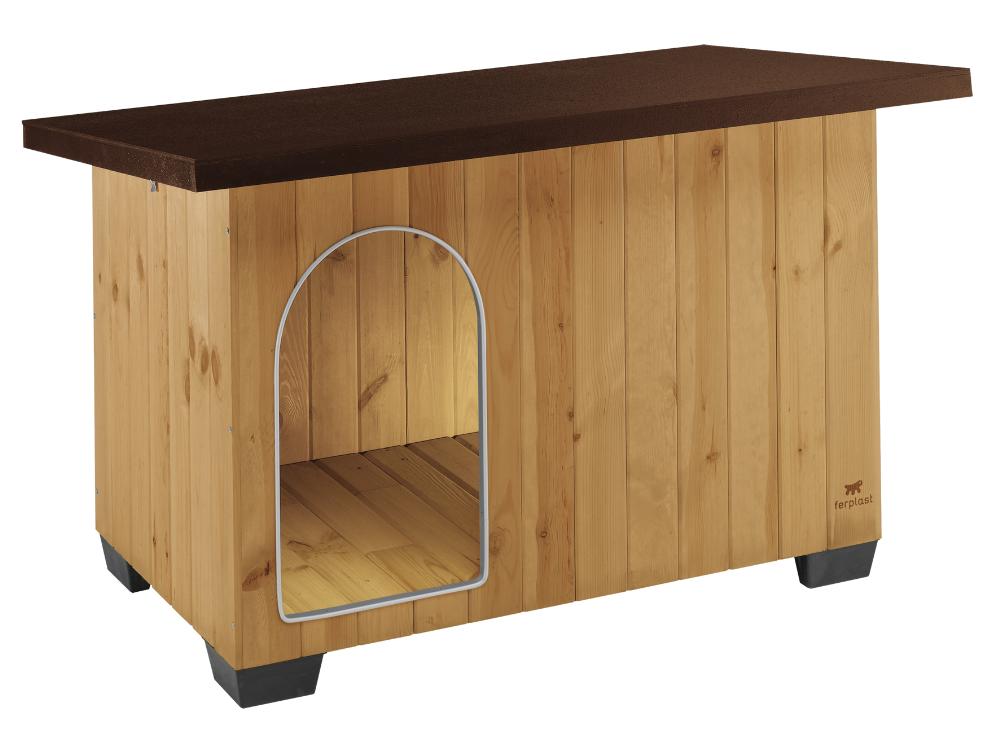 Niche extérieure pour chien. Toit traité dans un vernis spécial pour une durée de vie accrue. Pieds en plastique pour une plus grande isolation du sol. Crochet en métal pour ajuster le toit sur la niche.
